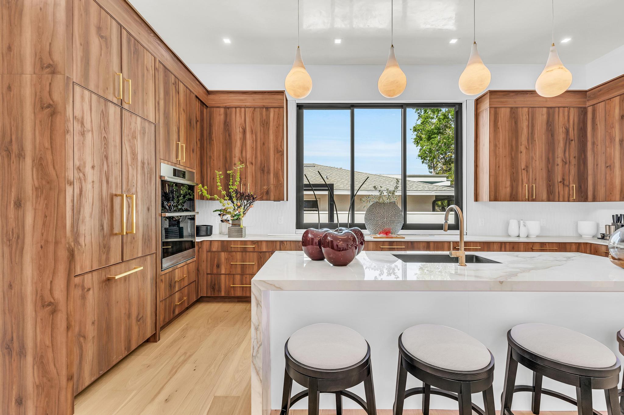 This new build in Sarasota’s Southgate neighborhood features modern-yet-warm custom cabinetry, quartz countertops, beautiful gold hardware, professional-grade appliances, a wet bar, high-end bathrooms (also with custom cabinetry), and a laundry room with cabinetry that echoes that of the kitchen and bathrooms. The layout makes it perfect for entertaining, and we love how the warm wood gives the kitchen a cozy cabin vibe while still remaining cool and current.